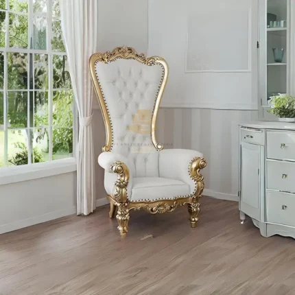 Redefine luxury in your personal sanctuary with our New Latest Furniture Designs 2026. This Royal High-Back Throne Chair is the pinnacle of High Quality Chinioti Furniture 2026, designed for those who seek the Best Royal Furniture in Chiniot 2026. Featuring a majestic hand-carved crown and elegant cabriole legs finished in premium gold leaf, this chair serves as a stunning visual anchor for any master bedroom or luxury parlor.