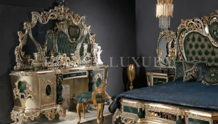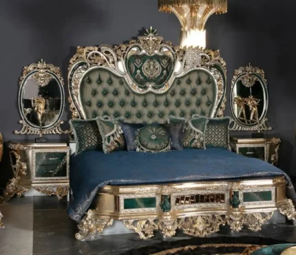 Redefine the meaning of grandeur with the New Latest Furniture Designs 2026. This Emerald Green & Gold Baroque Bed Set is a definitive masterpiece of High Quality Chinioti Furniture 2026, specifically engineered for elite clients who demand the absolute Best Royal Furniture in Chiniot 2026. Featuring a monumental, extra-wide "Crown" headboard with deep-relief Baroque floral carvings and rich emerald green tufted upholstery, this set establishes Gulzar Sons as a premier luxury brand 2026.
