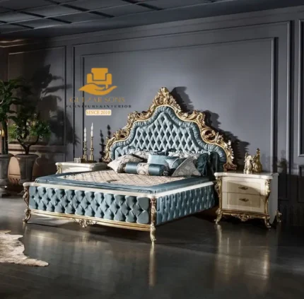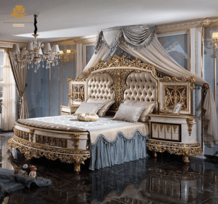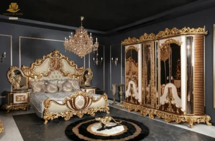 Experience the ultimate in regal slumber with the New Latest Furniture Designs 2026. This Royal Opulence Baroque Gold Leaf Bed Set is a breathtaking masterpiece of High Quality Chinioti Furniture 2026, meticulously crafted for elite clients who demand the Best Royal Furniture in Chiniot 2026. Featuring a monumental high-back headboard with exuberant hand-carved Rococo scrolls and deep-tufted velvet upholstery, this set establishes Gulzar Sons as a premier luxury brand 2026.