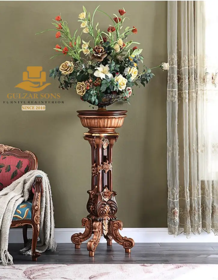 Command attention in your foyer or formal gallery with a signature statement from the New Latest Furniture Designs 2026. This Carved Wood Plant Stand (Code: N00096) is an extraordinary display of High Quality Chinioti Furniture 2026, featuring a deep-relief pillar design and a rich, multi-tonal finish. As a Top Quality Furniture Brand in Chiniot 2026, Gulzar Sons has combined classical Oriental silhouettes with traditional Chinioti craftsmanship to create the ultimate “Pedestal of Power.”