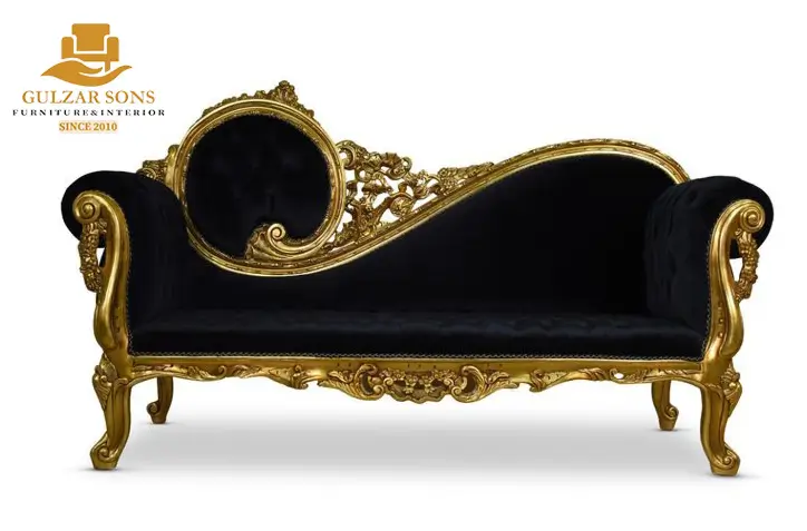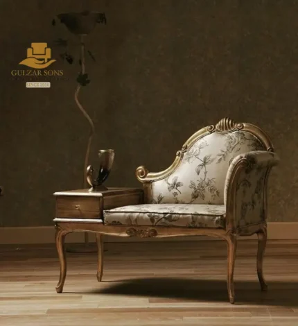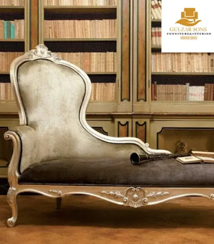 Command the attention of your space with the bold elegance of the New Latest Furniture Designs 2026. This Imperial Noir & Silver Chaise Lounge (Diwan) is a tour de force of High Quality Chinioti Furniture 2026, featuring a dramatic asymmetrical “S-curve” silhouette that defines modern palatial luxury. As a Top Quality Furniture Brand in Chiniot 2026, Gulzar Sons has utilized a sophisticated midnight-black velvet upholstery paired with radiant silver-leaf carvings to create a piece of undeniable presence.