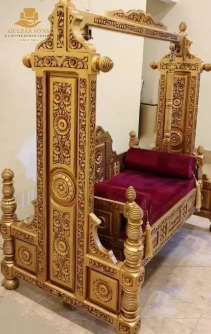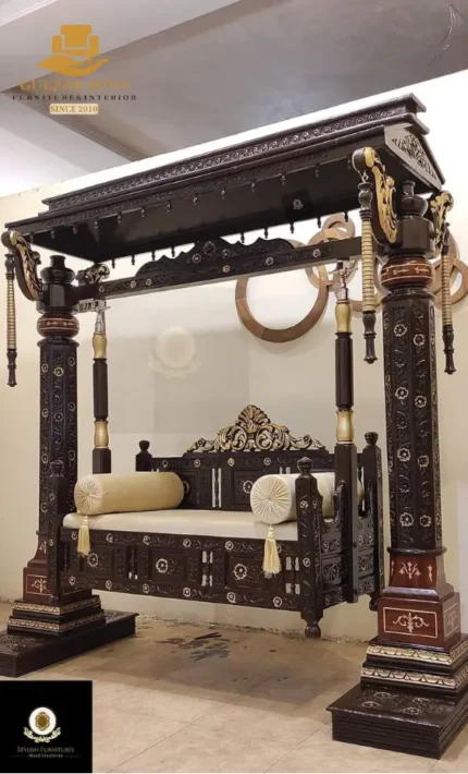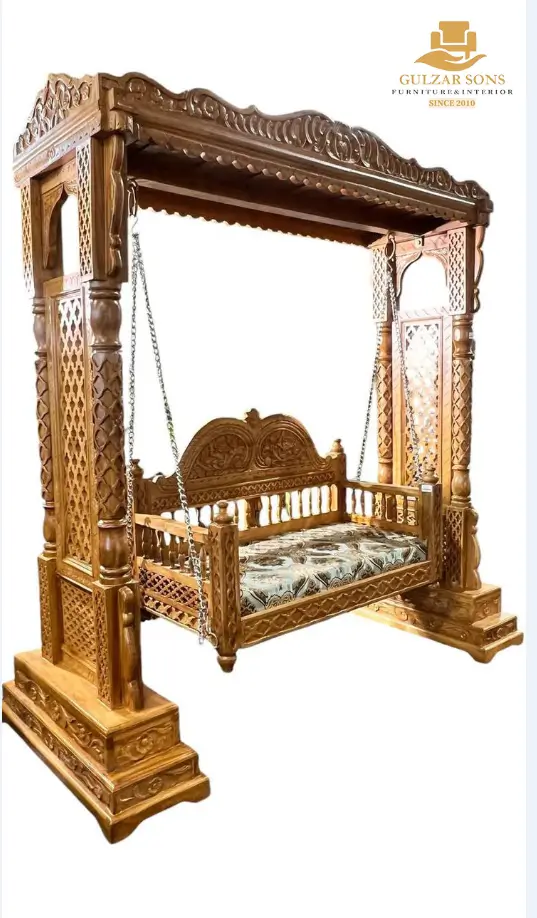 Bring home the soul of Chiniot with our exquisite Traditional Royal Wooden Swing. As a premier luxury brand 2026, Gulzar Sons Furniture offers you the Best Carving Furniture in Chiniot 2026, featuring masterfully hand-chiseled pillars and a grand canopy that reflects centuries of artistry. This Jhoola is designed for the sophisticated homeowner who values Best Quality furniture in chiniot 2026 and wants a centerpiece that tells a story of royalty.