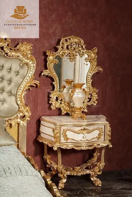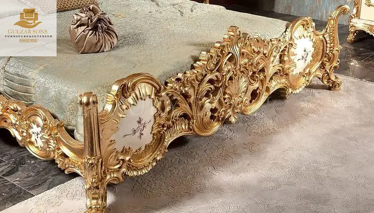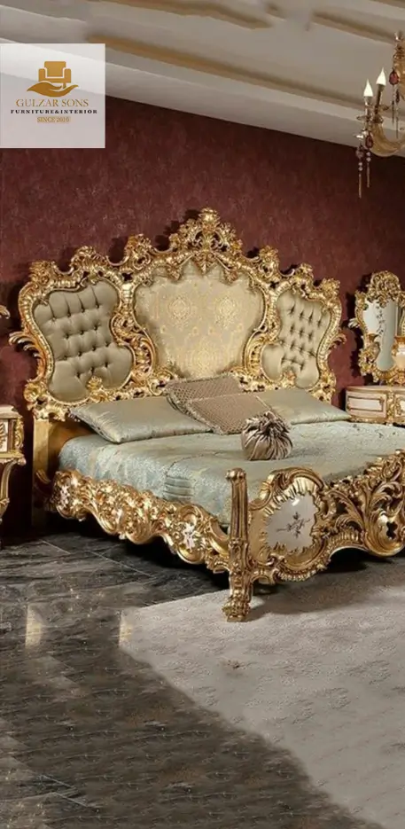 Masterfully hand-constructed from the Best Solid Shesham wood Furniture in chiniot 2026, the entire frame is seasoned in our private factories to guarantee Export Quality Chinioti Furniture 2026 standards for unrivaled durability. As a Top Quality Furniture Brand in chiniot 2026, we have utilized a rich 24K gold-leaf gilding across the exuberant Baroque carvings, perfectly contrasted by deep teal tufted velvet and dark mahogany-stained accents. Whether as the ultimate Best Jahaiz Package Furniture in Chiniot 2026 or a centerpiece for a private villa, this bed represents the Best Quality furniture in chiniot 2026. Visit our 3 grand showrooms to witness the imperial artistry of original Gulzar Sons.