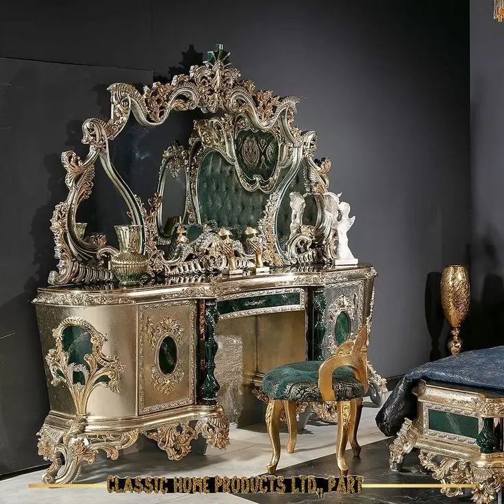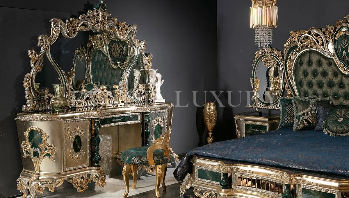 Redefine the meaning of grandeur with the New Latest Furniture Designs 2026. This Emerald Green & Gold Baroque Bed Set is a definitive masterpiece of High Quality Chinioti Furniture 2026, specifically engineered for elite clients who demand the absolute Best Royal Furniture in Chiniot 2026. Featuring a monumental, extra-wide “Crown” headboard with deep-relief Baroque floral carvings and rich emerald green tufted upholstery, this set establishes Gulzar Sons as a premier luxury brand 2026.