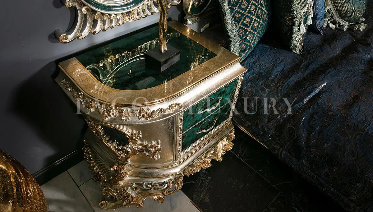 Finish: 24K Gold Leaf gilding with hand-applied emerald-stone textured inlays on the footboard and pedestals.