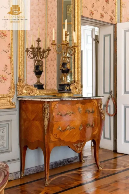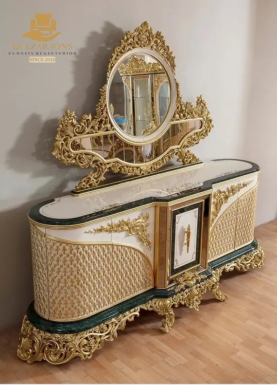 Experience the peak of majestic living with our New Latest Furniture Designs 2026. This Baroque Style Carved Console and Mirror set is a monumental example of High Quality Chinioti Furniture 2026, meticulously crafted for those who demand the Best Royal Furniture in Chiniot 2026. Featuring a sprawling, bowed silhouette with high-relief floral carvings and a matching ornamental mirror, this set establishes Gulzar Sons as a premier luxury brand 2026.