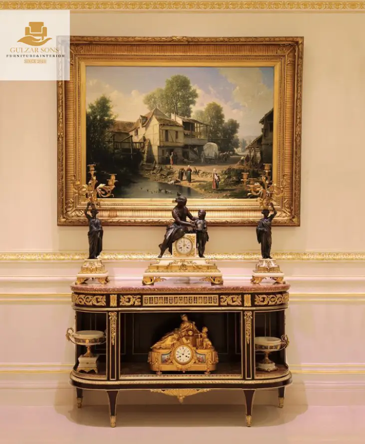 Elevate your home’s entrance with the New Latest Furniture Designs 2026. This French Neo-Classical Chester is a breathtaking example of High Quality Chinioti Furniture 2026, meticulously designed for clients who seek a premier luxury brand 2026. Featuring a rich ebony finish with intricate gold-brass filigree and a premium pink-veined marble top, this piece is the ultimate Best Royal Furniture in Chiniot 2026.