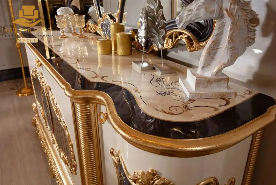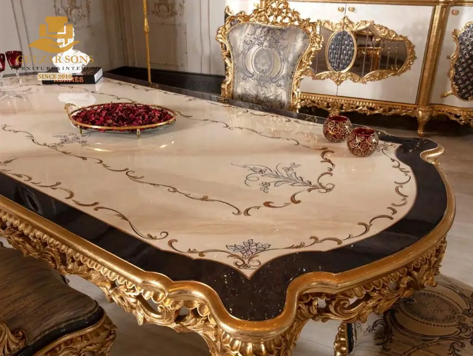 Redefine your banquet hall with the exquisite artistry of the New Latest Furniture Designs 2026. This Neo-Classical Gold Luxury Dining Set is a signature display of High Quality Chinioti Furniture 2026, featuring a grand architectural table and eight high-back “Regal” chairs. As a Top Quality Furniture Brand in Chiniot 2026, Gulzar Sons has masterfully finished this set with radiant 24K gold-leafing and sophisticated mirror-work inlays to create a setting of “Modern Royalty”.