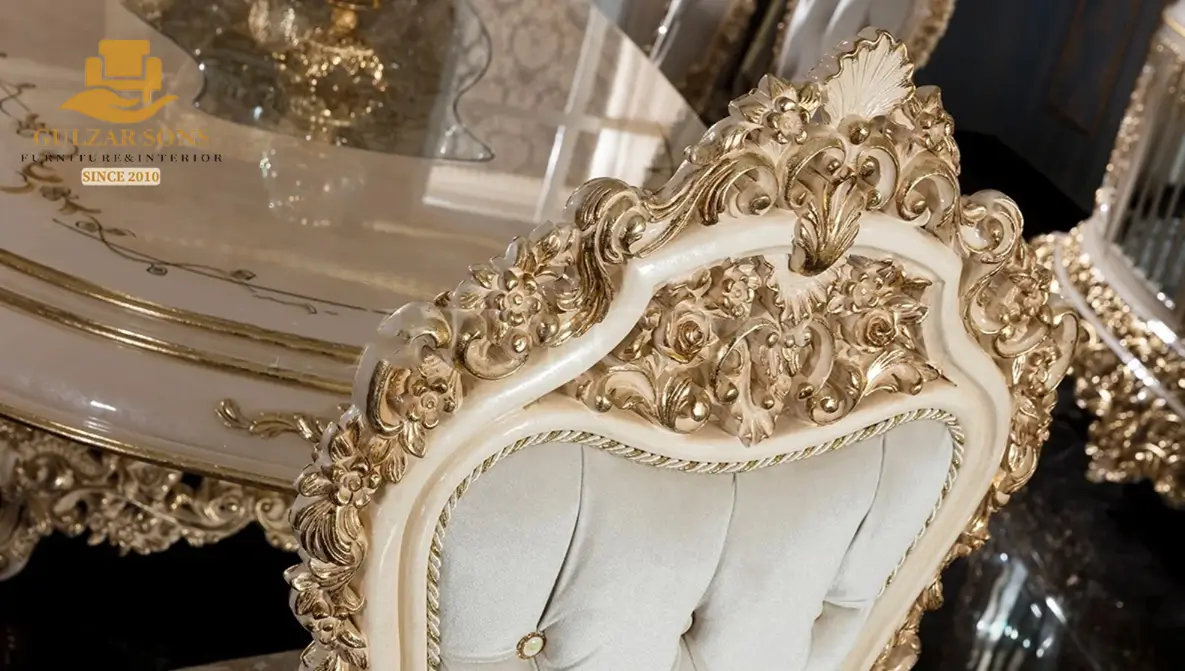 Masterfully hand-constructed from the Best Solid Sheesham wood Furniture in Chiniot 2026, every frame is seasoned in our private factories to guarantee Export Quality Chinioti Furniture 2026 standards. The chairs feature architectural tall-backs with deep-tufted ivory velvet and intricate open-work carving at the base. Whether chosen as the centerpiece of a Best Jahaiz Package Furniture in Chiniot 2026 or for a high-end manor, this set represents the Premium Quality Furniture in Chiniot 2026. Visit our 3 grand showrooms to witness the breathtaking scale of original Gulzar Sons.