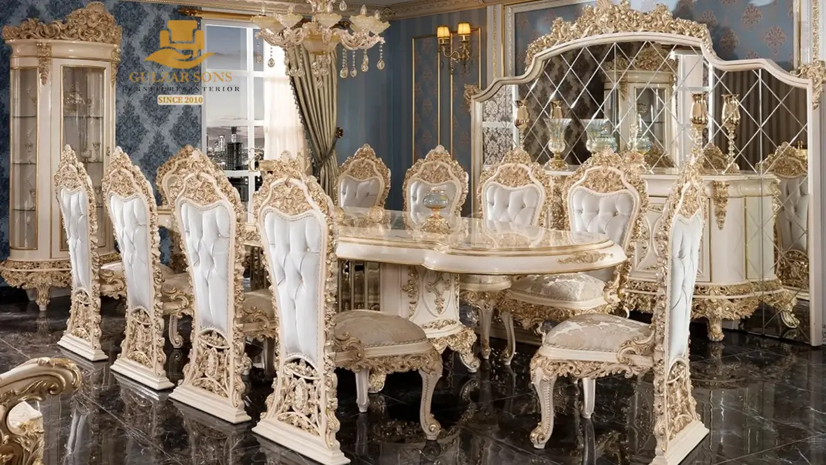 Redefine luxury entertaining with the New Latest Furniture Designs 2026. This Royal Emerald & Pearl Dining Set is an exquisite display of High Quality Chinioti Furniture 2026, featuring a grand oval pedestal table and eight “Empress” high-back chairs. As a Top Quality Furniture Brand in Chiniot 2026, Gulzar Sons has masterfully finished this set in a sophisticated “Pearl White” lacquer with flamboyant 24K gold-leaf hand-carving.