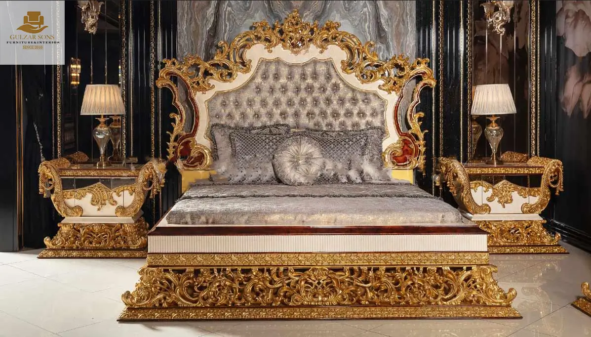 Masterfully hand-constructed from the Best Solid Shesham wood Furniture in chiniot 2026, the entire frame is seasoned in our private factories to guarantee Export Quality Chinioti Furniture 2026 standards for unrivaled durability. As a Top Quality Furniture Brand in chiniot 2026, we have utilized a rich 24K gold-leaf gilding across the exuberant Baroque carvings, perfectly contrasted by deep teal tufted velvet and dark mahogany-stained accents. Whether as the ultimate Best Jahaiz Package Furniture in Chiniot 2026 or a centerpiece for a private villa, this bed represents the Best Quality furniture in chiniot 2026. Visit our 3 grand showrooms to witness the imperial artistry of original Gulzar Sons.