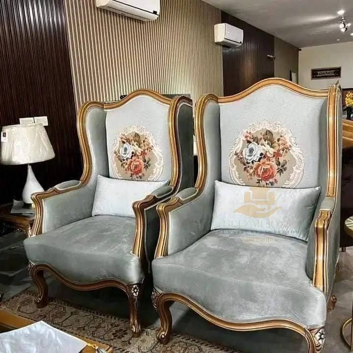 Transform your bedroom into a palace with our New Latest Furniture Designs 2026. This set of two Royal Wingback Chairs is a masterclass in High Quality Chinioti Furniture 2026, specifically crafted for those who demand the Best Royal Furniture in Chiniot 2026. Featuring a majestic high-back silhouette and a crown-style headrest, these chairs are finished with premium gold leafing that defines our status as a premier luxury brand 2026.