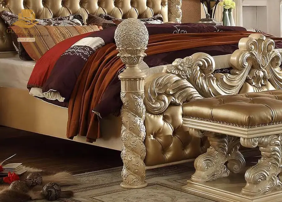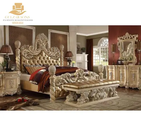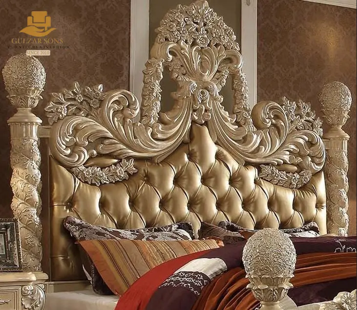This Best Quality Chinioti Furniture Brand Royal Gold Carved Poster Bed Set is a monumental fusion of architectural strength and Baroque opulence. Designed to be the definitive centerpiece of a palatial master suite, it combines the structural majesty of four-poster pillars with the plush comfort of deep-tufted gold leatherette.Redefine your sanctuary with the New Latest Furniture Designs 2026. This Royal Gold Carved Poster Bed Set is a premier example of High Quality Chinioti Furniture 2026, meticulously crafted for those who demand the absolute Best Royal Furniture in Chiniot 2026. Featuring massive hand-carved spiral pillars topped with ornamental finials and an exuberant Rococo headboard, this set establishes Gulzar Sons as a premier luxury brand 2026.