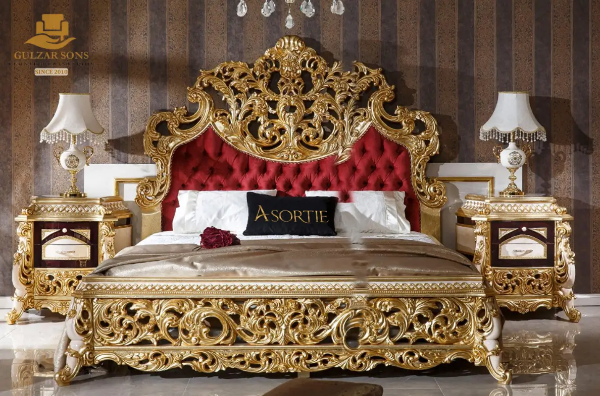 Bring the timeless elegance of a palace to your home with the New Latest Furniture Designs 2026. This Heritage Royal Victorian Carved Red Velvet Bed Set is an extraordinary example of High Quality Chinioti Furniture 2026, meticulously handcrafted for elite clients seeking the Best Royal Furniture in Chiniot 2026. Featuring a high-profile “Crown” headboard with deep-relief Victorian scrollwork and premium ruby-red tufted velvet, this set establishes Gulzar Sons as a premier luxury brand 2026.