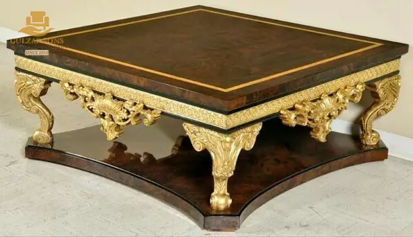 Command attention in your living space with a signature statement from the New Latest Furniture Designs 2026. This Imperial Square Center Table is an extraordinary display of High Quality Chinioti Furniture 2026, featuring a multi-tiered architectural design and deep-relief golden carvings. As a Top Quality Furniture Brand in Chiniot 2026, Gulzar Sons has combined rich wood textures with radiant gold leaf to create the ultimate “Centerpiece of Power.”