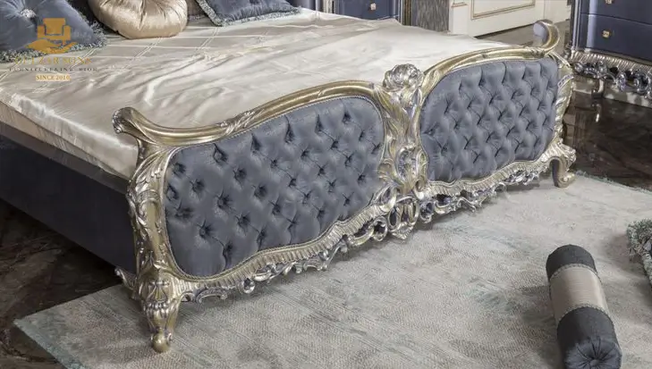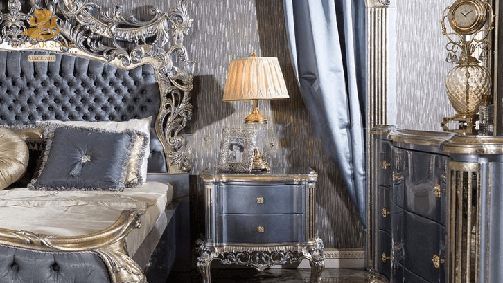 Set Includes:Â King-size bed frame and two matching silver-carved luxury side tables with velvet-front drawers.