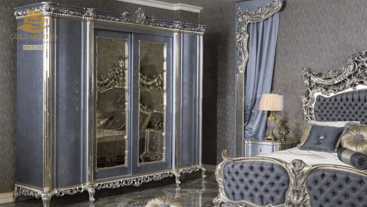 Transform your bedroom into a silver-shimmering palace with the New Latest Furniture Designs 2026. This Royal Baroque Silver Carved Velvet Bed Set is a breathtaking example of High Quality Chinioti Furniture 2026, meticulously crafted for elite homeowners who demand the Best Royal Furniture in Chiniot 2026. Featuring a high-profile, hand-carved silver headboard with deep-relief Baroque scrollwork and premium charcoal-grey tufted velvet, this set establishes Gulzar Sons as a premier luxury brand 2026.