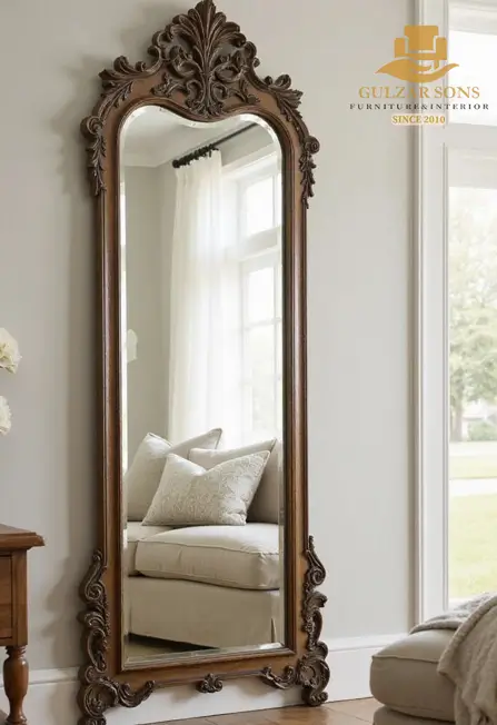 Masterfully hand-constructed from the Best Solid Sheesham wood Furniture in Chiniot 2026, the frame is seasoned to meet Export Quality Chinioti Furniture 2026 standards for lifelong durability. The mirror features ornate hand-carved acanthus leaf details at the crown and base, perfectly balanced by a sturdy architectural stand. Whether used as a functional centerpiece for a master suite or as a premium addition to a Best Jahaiz Package Furniture in Chiniot 2026, this mirror represents the absolute Premium Quality Furniture in Chiniot 2026.