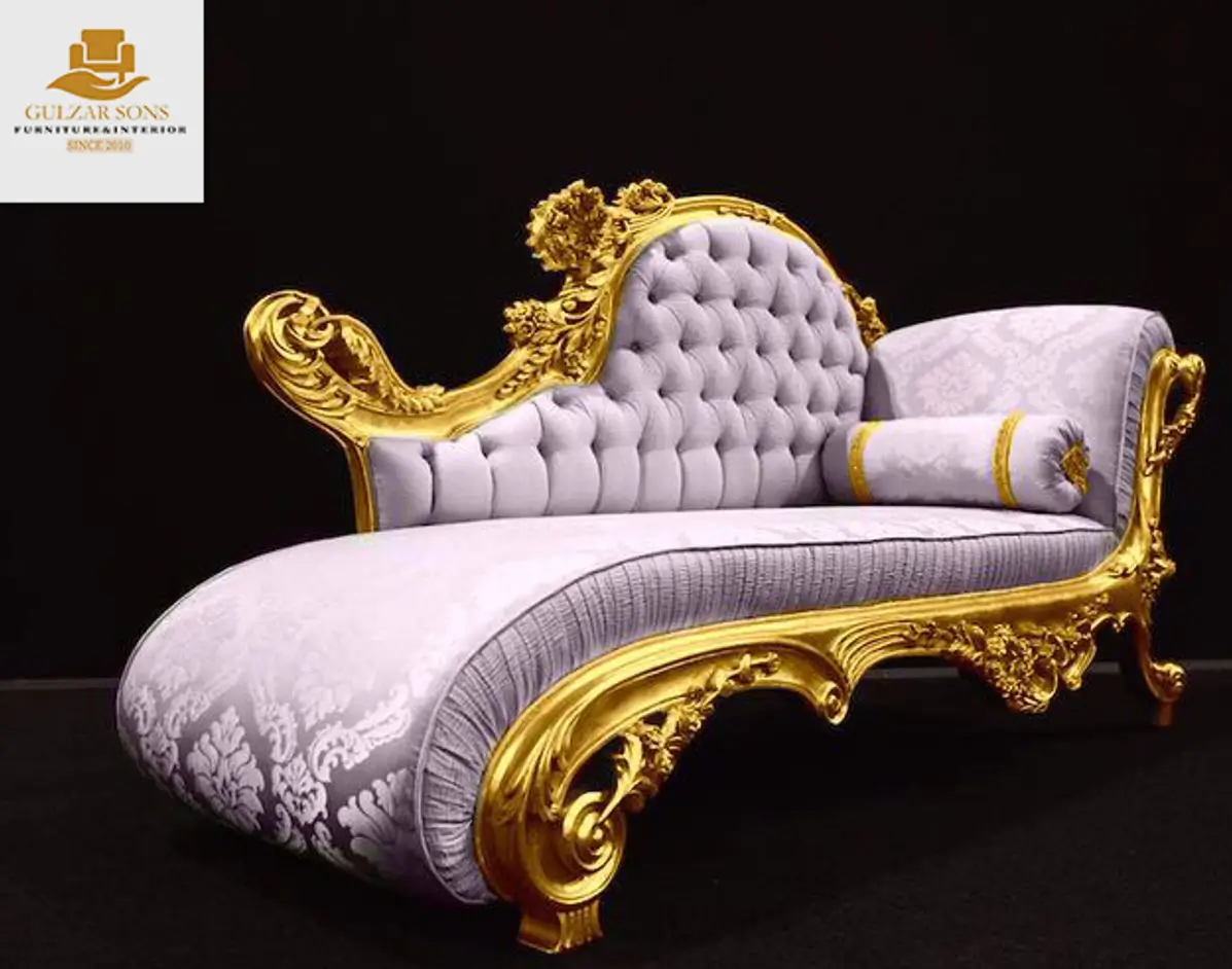 Redefine palatial luxury with the New Latest Furniture Designs 2026. This Imperial Lavender & Gold Chaise Lounge (Diwan) is a masterpiece of High Quality Chinioti Furniture 2026, featuring a majestic high-arched backrest with deep-set diamond tufting. As a Top Quality Furniture Brand in Chiniot 2026, Gulzar Sons has paired a rich lavender damask fabric with luminous gold-leaf gilding to create a setting of “Regal Tranquility”.